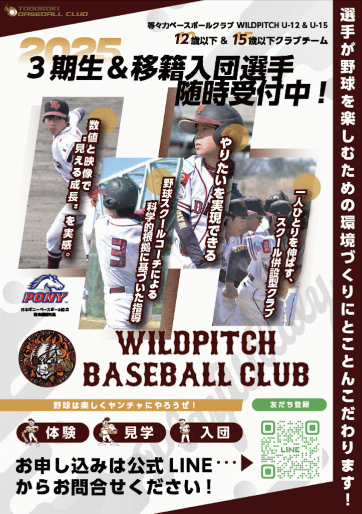 等々力ベースボールクラブ WILDPITCH U15は、2024年に設立されたばかりの新しい中学野球クラブチームです。そのため、現中学2年生の1期生と、現中学1年生の2期生の計9名で活動しています。IoT機器を使用したトレーニングや運動力学や解剖学に基づいた科学的根拠に基づいた指導を取り入れている他、メンタルコーチングを取り入れた、個人個人の心身の成長や目標に合わせたアプローチを取り入れています。野球スクール運営で培ったノウハウを活かした指導・チーム運営を徹底しています。そのため、短期間で野球スキルや野球に必要な運動能力が向上します。